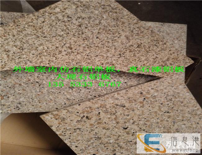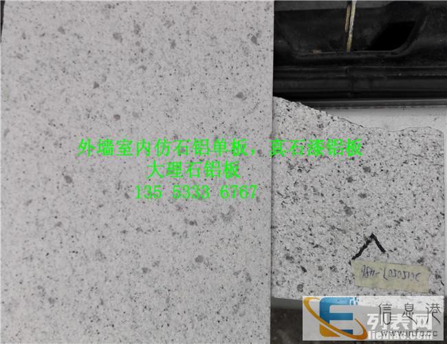 仿石铝单板是一种装饰效果酷似大理石、花岗石。主要采用各种颜色的天然石粉配制而成。真石漆铝单板装修后的建筑物,具有天然真实的自然色泽,给人以高雅、和谐、庄重之美感。适合于各类建筑物的室内外装修。特别是在曲面建筑物上装饰,可以收到生动逼真,回归自然的功效。真石漆具有防火、防水、耐酸碱、耐污染。无毒、无味、粘接力强,永不褪色等特点,能有效地阻止外界恶劣环境对建筑物侵蚀,延长建筑物的寿命,由于真石漆具备良好的附着力和耐冻融性能,因此特别适合在寒冷地区使用。真石漆施工简便,易干省时,施工方便等优点。仿石铝板的优势铝合金板材超强的造型能力与天然石材独具的豪华稳重、端庄艺术的艺术效果相结合,使得仿石铝板具备以下优势:轻质安全仿石铝板采用优质铝合金作为基材,表面涂装以天然花岗石碎粒、优质硅丙乳胶液和铝板专用弹性助剂制备的漆膜。自重轻、不会改变墙体负重的力学状况,不论安装还是使用,都非常安全和轻便。施工简便仿石铝由工厂预制装配幕墙构件,现场只需采用金属幕墙通用的干挂施工即可完成,施工过程比石材更加安全和简便,施工周期更比干挂石材缩短不止一倍。造型丰富仿石铝板基材铝合金板所具有的易加工性能和天然花岗石碎漆膜涂层所具有的丰富选择性,能够轻易制造出天然石材所难以完成的各种复杂造型,最大限度的满足了建筑及造型的需要,能充分体现设计的创意,帮助设计师们更好的表达设计理念。造价经济仿石铝板的材料成本、安装造价和翻新费用之间低、是天然石材所望尘莫及的、大大减低了业主的经济负担。根据外墙饰面砖工程及验收规程JGJ的有关规定,水泥基粘结材料符合现行业标准陶瓷墙地砖胶粘剂JC/T547的技术要求并应按现行行业标准建筑工程饰面砖粘结强度检验标准JGJ110的规定,在实验室进行制样检验粘结强度不得小于0.6MPa。并且明确要求不得采用有机物作为主要粘结材料。仿石铝板仿石层的粘结强度达到3.7MPa为仿石面层的安全性能提供了绝对保证。
