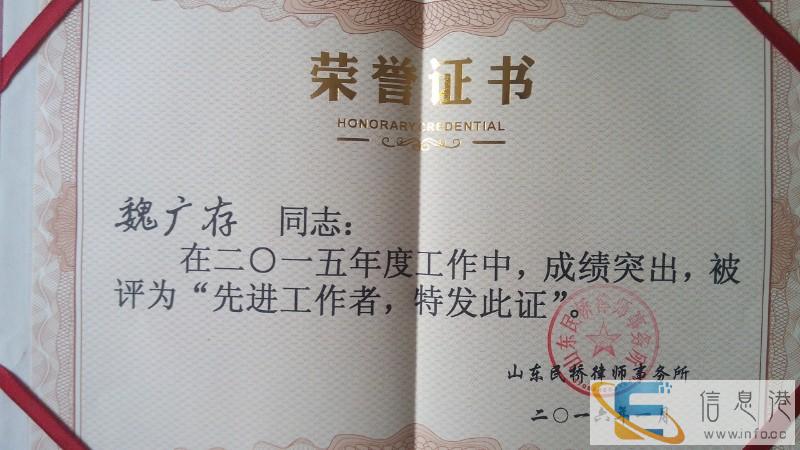 魏广存律师是山东民桥律师事务所专职律师,擅长离婚案件、劳动争议案件、工伤案件、交通事故案件、债权债务纠纷、合同纠纷、房地产案件、建筑工程案件,15年来,办理民商事案件上千件,胜诉率高,当事人满意,取得很好的法律效果和社会效果,多次获得“先进法律工作者”、“先进工作者”等荣誉,现担任多家企事业单位法律顾问,是中华全国律师协会会员,济宁律师协会会员。执业理念:受人之托,忠人之事。 勤勉尽责,精益求精。解决当事人纷争是我们的责任!魏广存律师愿热诚为您提供优质法律服务!欢迎你来电咨询。咨询办公地址:济宁市高新区英萃路149号英特力科技园1号楼5层山东民桥律师事务所代理婚姻家庭纠纷:进行婚姻案件调解和好;如感情已完全破裂,协助双方协议离婚;代理一方向法院起诉离婚或代理被告应诉。代写诉状,协助当事人立案,出庭诉讼。正常婚姻,可协助当事人进行夫妻财产约定,家庭纠纷调解。老人赡养,子女抚养方面提供法律意见、方案。遗嘱见证、协助公证。代理遗产继承案件、婚姻无效、婚姻撤销、婚外同居、子女抚养权与抚养费、财产分割等。15年来成功代理了张画家离婚案、聋哑人离婚案、精神病人离婚案、家庭暴力离婚案、第三者插足离婚案、变更抚养关系案、增加抚养费案、赡养老人纠纷案等等。代理交通事故纠纷:交通事故发生后,协助当事人进行交通事故处理,责任认定复核,协助当事人进行赔偿调解,协助伤残鉴定,代理当事人进行交通事故诉讼等。代理劳动争议纠纷:代理当事人进行工伤认定,劳动关系确认,劳动能力鉴定,代理工伤索赔,代理劳动争议调解,代理劳动仲裁,代理劳动争议诉讼等。15年来成功代理了袁某工伤案、毛某工伤案、田某保险、加班费、经济补偿费案、张某被违规辞退案等等。代理房地产纠纷调解,代理房地产纠纷诉讼,包括房屋产权纠纷、房屋买卖纠纷、房屋继承纠纷、房屋租赁纠纷、房屋抵押、典当纠纷、房地产相邻关系纠纷、土地使用权纠纷等,索要工程款,协助当事人买房置业,提供法律咨询。代理刑事自诉、刑事附带民事诉讼、刑事辩护、提供法律咨询、代为申诉、控告及申请取保候审、提供法律参考意见。代理各种合同纠纷:如买卖合同,赠与合同,借款合同,租赁合同,融资租赁合同,承揽合同,建设工程合同,运输合同,技术合同,保管合同,仓储合同,委托合同,行纪合同,居间合同,担保合同等纠纷。经济合同审查、签订、谈判等律师服务。代理债权债务纠纷:代理借款、欠款、拖欠工程款等纠纷。