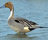 针尾鸭是中型游禽,属水鸭类。体长43-72厘米,体重0.5-1千克。雄鸭背部满杂以淡褐色与白色相间的波状横斑,头暗褐色,颈侧有白色纵带与下体白色相连,翼镜铜绿色,正中一对尾羽特别延长。雌鸭体型较小,上体大都黑褐色,杂以黄白色斑纹,无翼镜,尾较雄鸟短,但较其他鸭尖长。飞行迅速。在各种内陆河流、湖泊、低洼湿地都可以见到它们的身影,在开阔的沿海地带,如空旷的海湾、海港等地常能够见到数百只的集群。主要以草子和其他水生植物,如浮萍、松藻、牵牛子、芦苇、菖蒲等植物嫩芽和种子等植物性食物为食,也到农田觅食部分散落的谷粒。广布于欧亚大陆北部、北美西部。越冬在东南亚、印度、北非、中美洲,少数终年留居南印度洋的岛屿上。针尾鸭在1龄时性成熟,并可进行交配和营巢繁殖。对的形成过程相当快,多数雌鸟在冬季结束之前即已结合成对,少数求偶行为持续到第二年春季迁徙期间。繁殖期4-7月。营巢于湖边、河岸地上草丛中或有稀疏植物覆盖的低地上,通常距水域50-100m远。每窝产卵6-11枚,通常1年1窝,早在4月末开始产卵,也有迟至6月末的。孵卵全由雌鸟承担,雄鸟通常仅在孵化期开始时在巢附近警戒,当人至巢域时,雄鸟飞到巢上空不断鸣叫,直到雌鸟离巢,孵化期21-23天。雏鸟早成性,孵出后不久即能行走和游泳,并在雌鸟带领下经过35-45天即能飞翔。