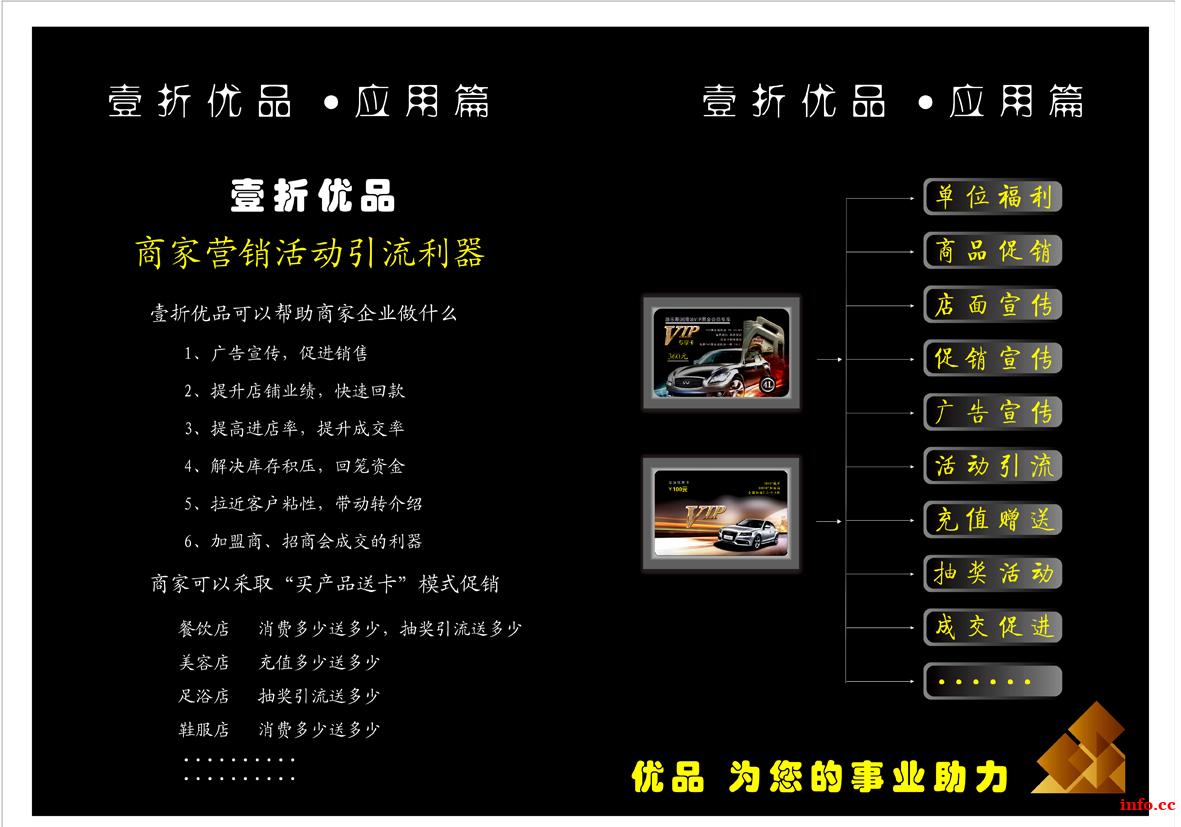 壹折优品是把高品质、高价位商品进行一折化销售,壹折加油购物通用商品,壹折保养机油商品,通过商品一折化后,消费者更容易消费,市场更大,应用行业范围更广,可以作为各行业的促销品,礼品等运用于商品促销,店面宣传等等,也是投资小、市场大、收益高的创业项目之一